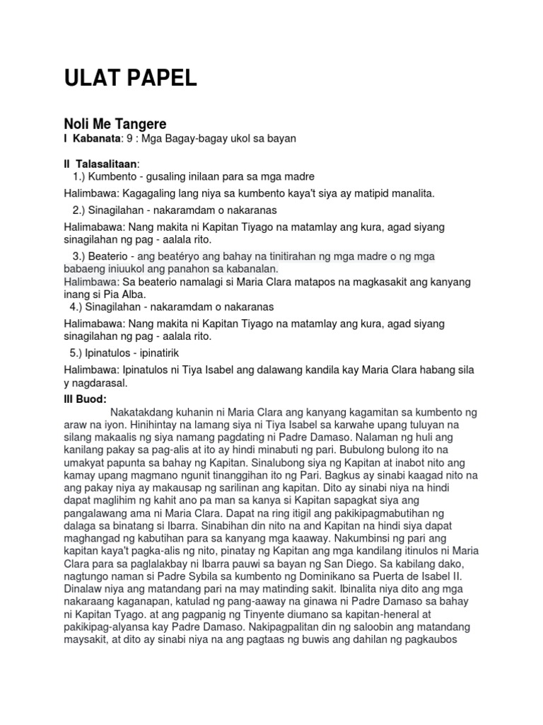 Mga Bagay-bagay Ukol Sa Bayan Buod Noli Me Tangere. Nang malaman niyang papunta ang magtiya sa Beaterio upang kuhanin ang kagamitan ni Maria ay kaagyat na umakyat si Damaso upang kausapin si Kapitan Tiyago. Nakagayak na ang magtiyahin na donya isabel at maria clara upang pumunta.
